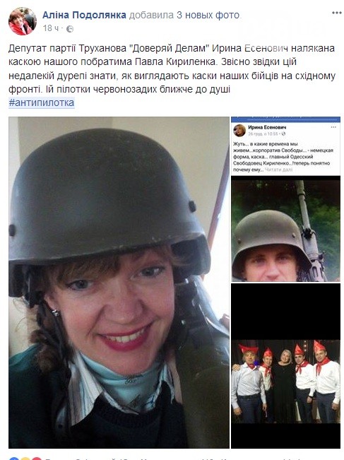 Есенович попыталась парировать, опубликовав фото одесского нардепа Павла Кириленко. Депутатша спутала каски украинских военных с немецкими «котелками».