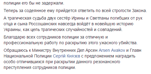 "Подозреваемым по делу об убийстве Ирины Ноздровской является Юрий Россошанский, отец Дмитрия Россошанского, того самого, что два года назад сбил насмерть сестру Ирины - Светлану Сапатинскую. Юрий Россошанский люто ненавидел Ирину Ноздровскую. Он надеялся, что его сына выпустят из СИЗО по амнистии ещё в начале этого года, но Ирина своей публичной активностью и напором всячески препятствовала этому, требуя максимального наказания за гибель своей сестры. В тот роковой день 29 декабря, вечером, Юрий Россошанский и Ирина Ноздровская случайно столкнулись на остановке маршрутки в посёлке Демидов. Между ними началась словесная перепалка в ходе которой Юрий Россошанский выхватил из кармана самодельный нож и ударил им в горло Ирину Ноздровскую. После чего, он схватил ее бездыханное тело, забросил на плечи и вынес с места преступления для того, чтоб затем утопить в протекающей рядом речке. Если бы Ирина и Юрий не столкнулись в тот роковой вечер на той остановке маршрутки, то скорее всего Ирина осталась бы жива", - уточнил Геращенко.
