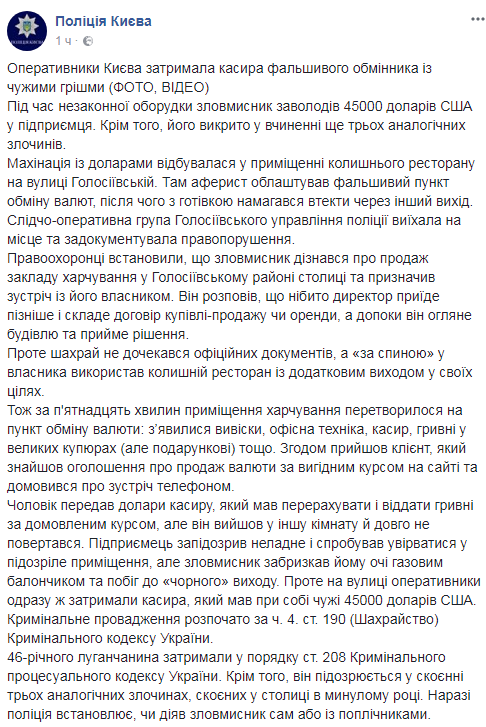 "Махинация с долларами проходила в помещении бывшего ресторана на улице Голосеевской. Там аферист устроил фальшивый пункт обмена валют, после чего с наличными пытался бежать через другой выход", – сказано в сообщении.