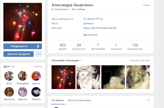 Кроме того, в друзьях у Андрея Захарченко есть девушка по имени Александра Захарченко. Она проживает в Донецке. В списке ее друзей также есть несколько страниц главаря "ДНР".