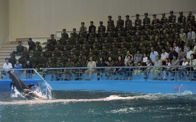Во время посещения дельфинария в Пхеньяне можно снимать дельфинов, но не солдат, которые составляют 99% посетителей.