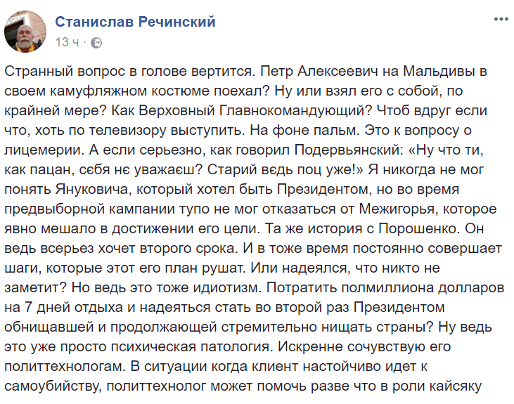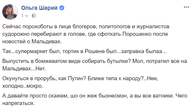 "Сейчас порохоботы в лице блогеров, политологов и журналистов судорожно перебирают в голове, где сфоткать Порошенко после новостей о Мальдивах.