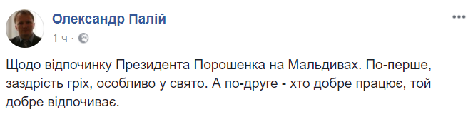 "Относительно отдыха Президента Порошенко на Мальдивах. Во-первых, зависть грех, особенно в праздник. А во-вторых – кто хорошо работает, тот хорошо отдыхает", – заявил он в Facebook.
