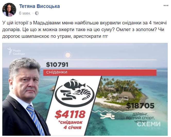 "В этой истории с Мальдивами меня больше всего взбесили завтраки по 4000 долларов. Это что же можно сожрать такое на эту сумму? Омлет с золотом? Или дорогое шампанское по утрам, аристократы ггг", - пишет журналистка Татьяна Высоцкая.
