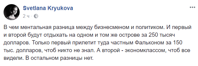 "В чем ментальная разница между бизнесменом и политиком. И первый и второй будут отдыхать на одном и том же острове за 250 тысяч долларов. Только первый прилетит туда частным Фальконом за 150 тыс. долларов, чтоб никто не знал. А второй – экономклассом, чтоб все видели. В остальном разницы нет", – написала Крюкова в Facebook.