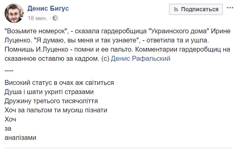 "Помнишь Ирину Луценко - помни и ее пальто. Комментарии гардеробщиц на сказанное оставлю за кадром", - написал журналист.