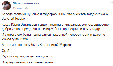 Так, некоторые намекнули, что Ирине Луценко недолго до повторения судьбы старухи из сказки "О Золотой Рыбке", которая захотела стать Владычицей морскою