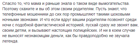 "Спасло то, что мама и раньше знала о таком виде вымогательства. Поэтому скажите и вы об этом своим родителям. Пусть знают, что телефонные мошенники до сих пор промышляют такими шоковыми ночными звонками", - добавила она.