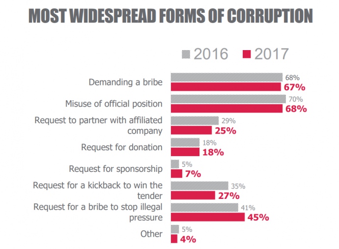 По результатам опроса, 36% респондентов считают, что уровень коррупции снизился за последний год (в 2016 году таких было 47%).