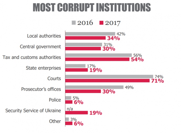 По результатам исследования, 71% респондентов считают, что наиболее коррумпированными государственными органами являются суды, 54% считают, что это налоговые и таможенные органы, 34% — что это местные органы власти.