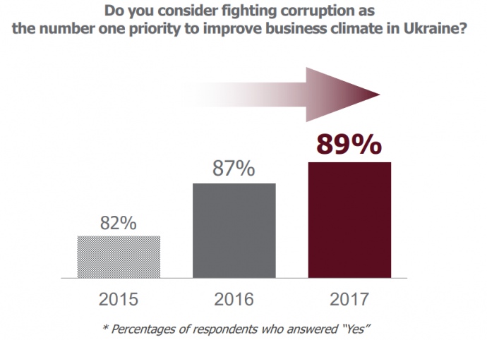 «Коррупция остается проблемой для представителей бизнеса в Украине. 89% опрошенных считают, что борьба с коррупцией является первоочередной для улучшения бизнес-климата в Украине. 76% представителей бизнес-сообщества Украины не считают необходимым прибегать к коррупции, чтобы добиться успеха «, — прокомментировал президент Американской торговой палаты в Украине Андрей Гундер.