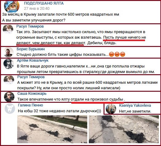 13. Ялта. Ватники, обсуждая очередной отчет оккупантов о наноремонте дорог, вопят, что таких ужасных дорог НИКОГДА не было, и ждут путина, который, кстати, недавно был в Ялте, но не помог. А у запоребриковой ваты конкретно бомбануло от скуления крымской ваты — требуют валить обратно: “За месяц в Крыму залатали почти 600 метров квадратных ям. А вы заметили улучшения дорог?”. Ответы: “Засыпают ямы настолько сильно, что ямы превращаются в огромные выступы, с которых аж взлетаешь. Пусть лучше ничего не делают, чем делают так, как делают. Дебилы, бл*дь”, “Стыдно должно быть такие цифры показывать”, “В Ялте дороги — говно. Налепили х*йни. Она где поплыла от жары прошлым летом, превратившись в стиралку, где дождями вымыло до ям”, “А может, это не в Крыму, а по всей рашке 600 квадратных метров латками покрыли? Ну, или они просто нолик лишний написали”, “Такое впечатление, что Ялту отдали на произвол судьбы”, “Нет, не заметили”, “Тот, кто делает такой ремонт дорог, самим не стыдно, не смешно? Такого безобразия, которое творится в этом вопросе в Ялте, никогда не было”, “Такое чувство, что начальство муниципальных служб передвигается на танках, не замечая, в каком состоянии дороги. Без намеков, но при Украине дороги в Ялте были намного лучше. Когда уже Владимирович приедет к нам и раз@бет этих дорожников?”, “Бла-бла-бла, видимость нормального государства создают, а на деле нет”, “В Ялте дорог нет, а те, что пытаются делать, делают ещё хуже”, “Дорога по Володарского к Колоннаде была норм, дырок вообще не было. Потом приехали чудо-работники, выпилили асфальт, сняли его, сделали новые латки, которые первым дождем и смыло. Теперь дыра на дыре. Зачем было ковырять нормальное покрытие?!”, “(Из россии пишет) Комментарии про плохие дороги, дорогую квартплату и т.д. Читать неприятно. Плюс некоторые личности кричат, что в хохляндии им жилось хорошо, и все было. Так раз все было, пусть валят туда. Все у них там будет. Никто ведь никого не держит. Пусть выходят на улицу и требуют референдум обратно. Только бюджетные деньги тратить на неблагодарных. Зачем — я лично не понимаю” нность вере и отечеству”. Свою книгу, в которой преступница радостно описала свои репрессии против активистов Евромайдана, проукраинских крымчан и борьбу с Меджлисом, курва назвала “замечательной”. Думаю, в Гааге с удовольствием изучат содержание этой явки с повинной