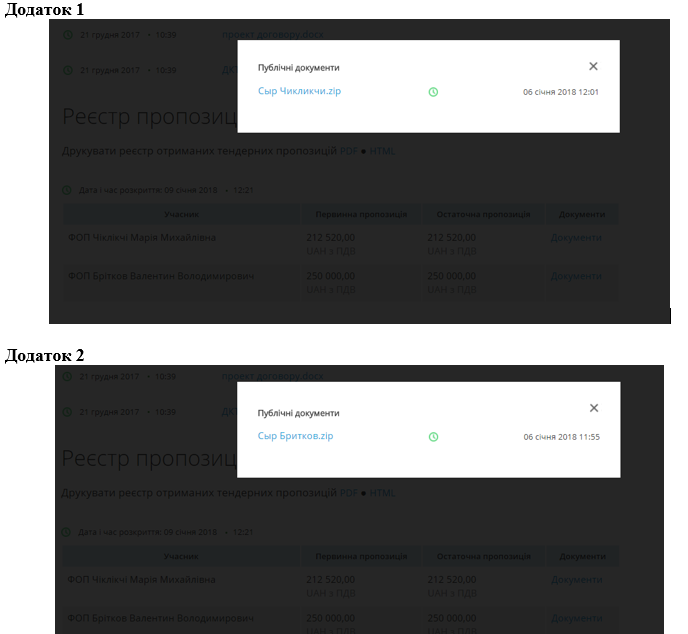 Теперь по цене. ЧП Чикликчи Мария Михайловна, как отмечалось выше, предлагал меньшую цену - 212 520 гривен. Якобы у предпринимателя были все шансы на победу, тем более, что соперник - ФЛП Бритков - даже не снизил цену своего предложения (первичная и окончательная суммы не отличаются), то есть по факту торгов как таковых и не было. И в протоколе раскрытия видно, что 11 января заказчик признает именно ФЛП Чикликчи победителем. Однако уже 25 января это решение отменяется из-за недостатка документов у предпринимателя, а победителем признается Бритков.