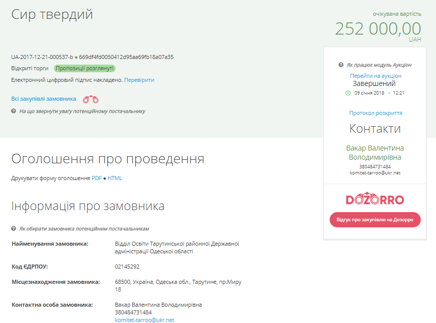 В конце 2017 отдел образования Тарутинской райгосадминистрации Одесской области объявил тендер на закупку твердого сыра. Аналитики Офис Регионального Развития заподозрили участников аукциона в нарушении Закона Украины «О защите экономической конкуренции». Далее расскажем, в чем именно.