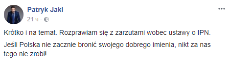 Заместитель министра юстиции Патрик Яки написал: "Если Польша не начнет защищать свое доброе имя, никто не сделает это за нас!"