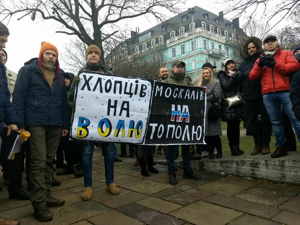 Кроме них присутствует на акции и "Правый сектор". Держат в руках плакат с призывами убийств: "Хлопців на волю, москалів на тополю".