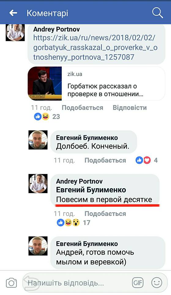 26 січня ц.р. я зробив на своїй сторінці допис щодо Наташи Влащенко і її скарг на Антошу Геращенко, в коментарі до якого зауважив, що інтерв’ю, яке транслюється на всю країну, з політичним шахраєм і юридичним аферистом Андрюшею Портновим є морально неприпустимим для журналіста. Бо є піаром цього негідника і пропагандою його збочених поглядів.