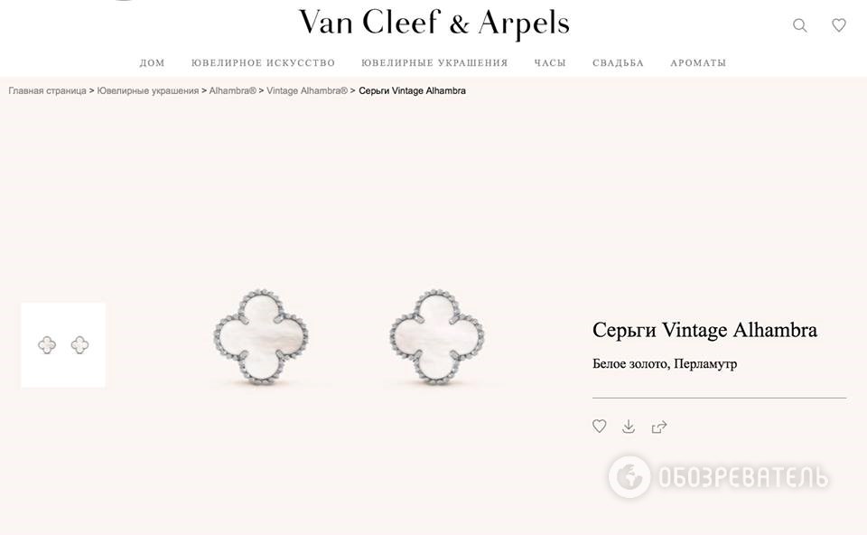 На официальном сайте ювелирного дома отмечается, что модель, замеченная на Южаниной, отличается вневременной элегантностью. "Форму этих легендарных символов удачи, навеянных образом четырехлистного клевера, подчеркивает обрамление из золотых бусинок. Серьги Vintage Alhambra, белое золото, белый перламутр", - говорится в описании модели.