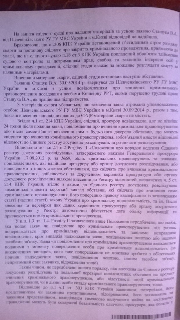По словам юрисконсульта, на место происшествия была вызвана милиция, а после этого Пивнюк и Ищук объясняли работникам РРТ, что такого объекта в Святошинском направлении вообще не существует на балансе предприятия. Еще через день Михаилу Славянину отменили все доверенности, чтобы он не мог обратиться в милицию от имени Концерна.