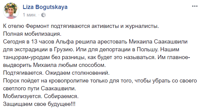 "Полная мобилизация. Сегодня в 13 часов Альфа (позже ее присутствие опровергли в СБУ - ред.) решила арестовать Михаила Саакашвили для экстрадиции в Грузию. Или для депортации в Польшу. Нашим танцорам-уродам без разницы, как будет это называться. Им главное- выдворить Михаила любым способом. Подтягивается. Ожидаем столкновений", - написала она в Fаcebook.
