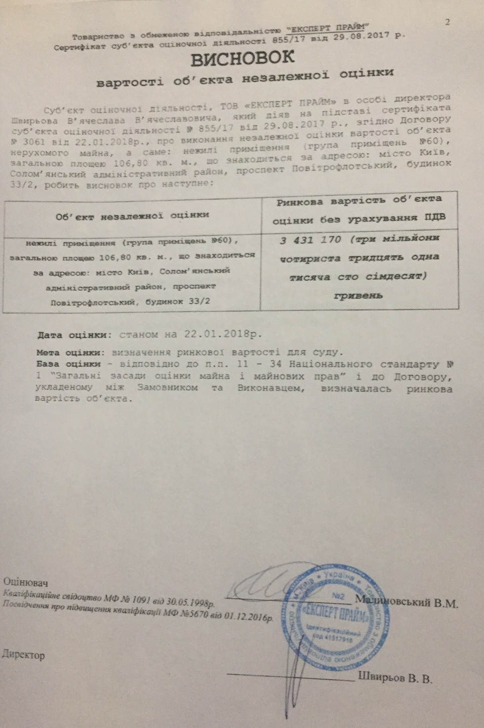 Врешті, в результаті оборудки «РАЙТ ПАРТНЕР» порушила ще декілька законодавчих актів. Згідно висновку — вартості об’єкта незалежної оцінки (приміщення за адресою: м. Київ, просп. Повітрофлотський 33/2, його ринкова вартість складає 3 431 170 грн.