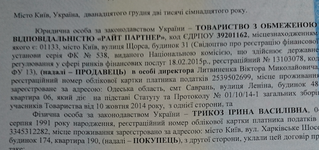 Скрін копії уривків з договору між «РАЙТ ПАРТНЕР» та Трикоз О.В.