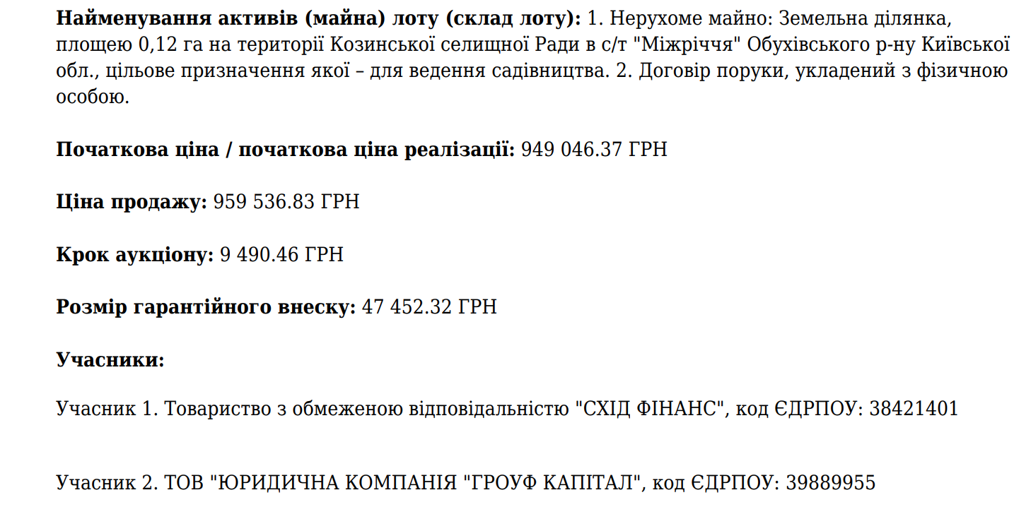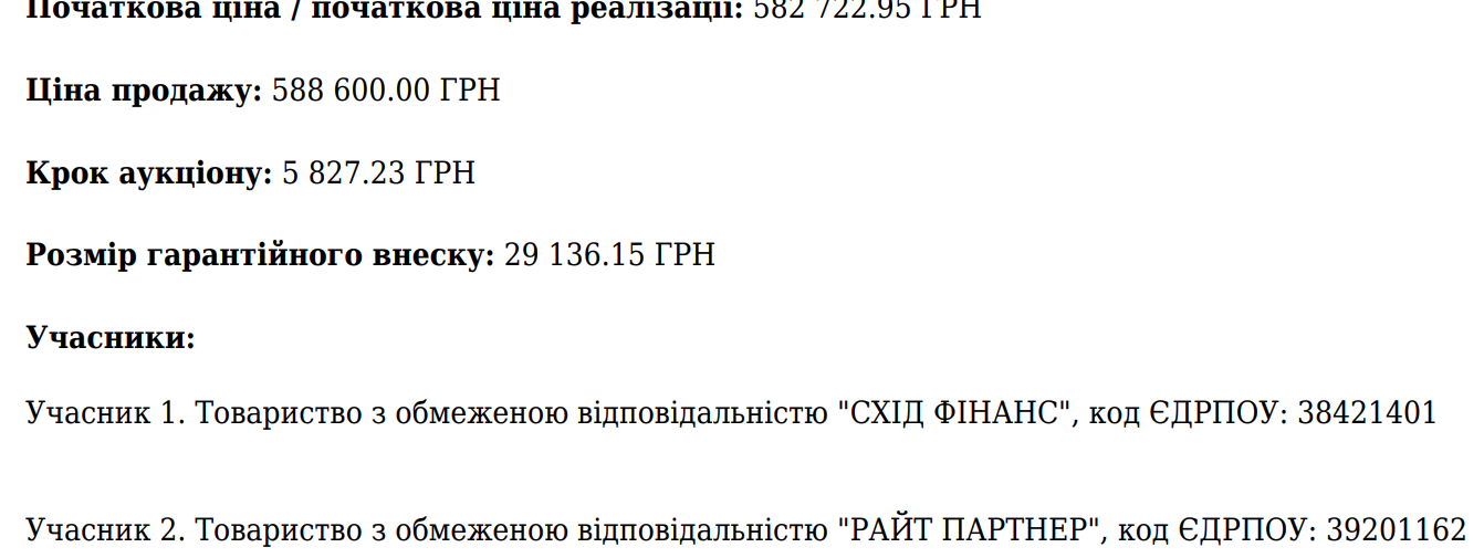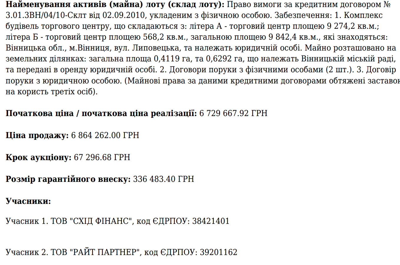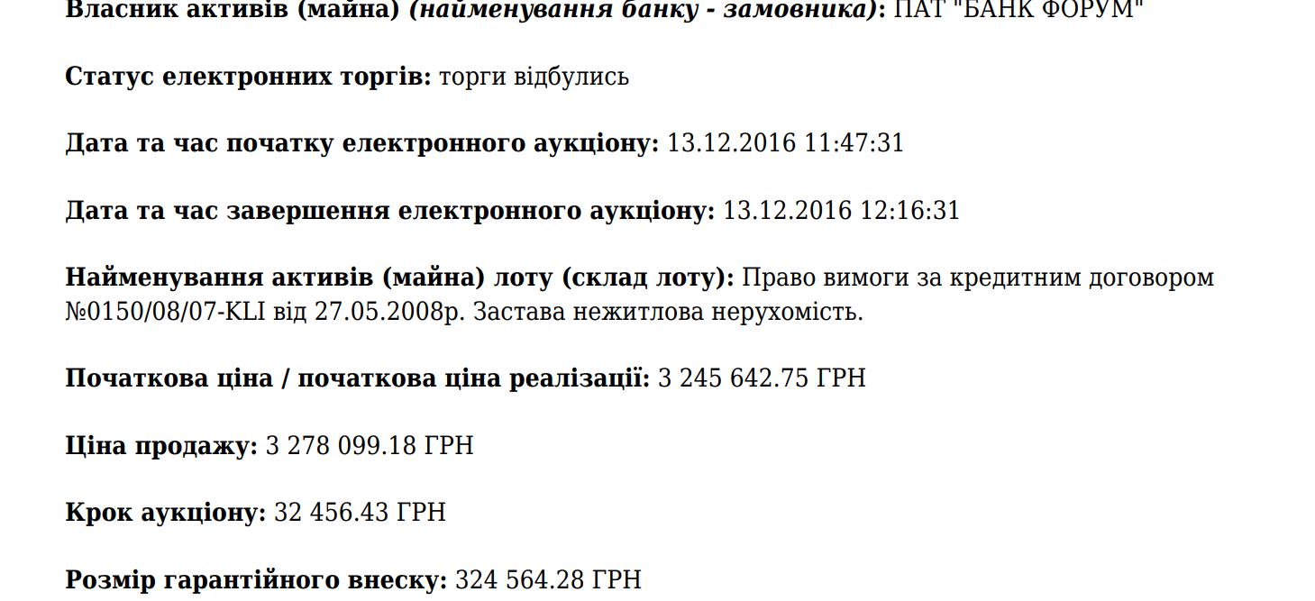 Уривок з протоколу електроних торгів, на яких «ФІДОБАНК» реалізував актив — іпотечний борг О.С.Лазуткіної.