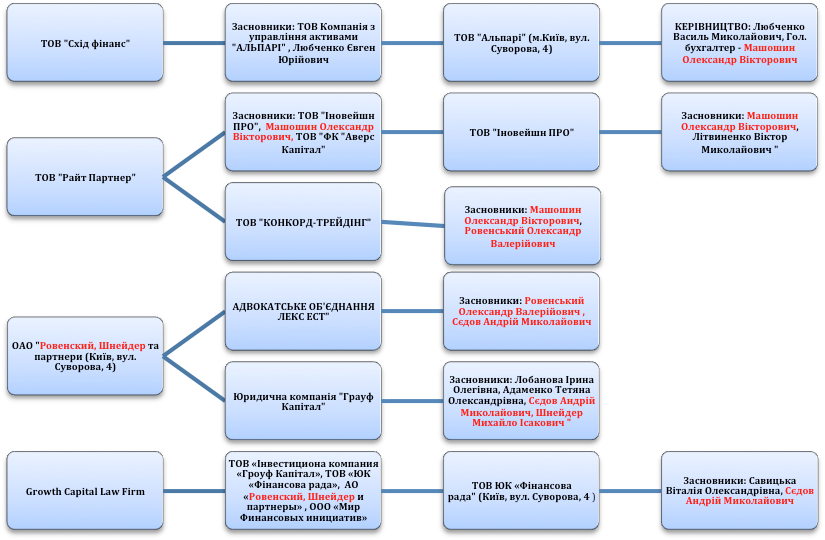 Схема афільованих структур донецького синдикату (насправді компаній багато більше, в схемі представлені наближені до рейдерського захоплення книгарні компанії).