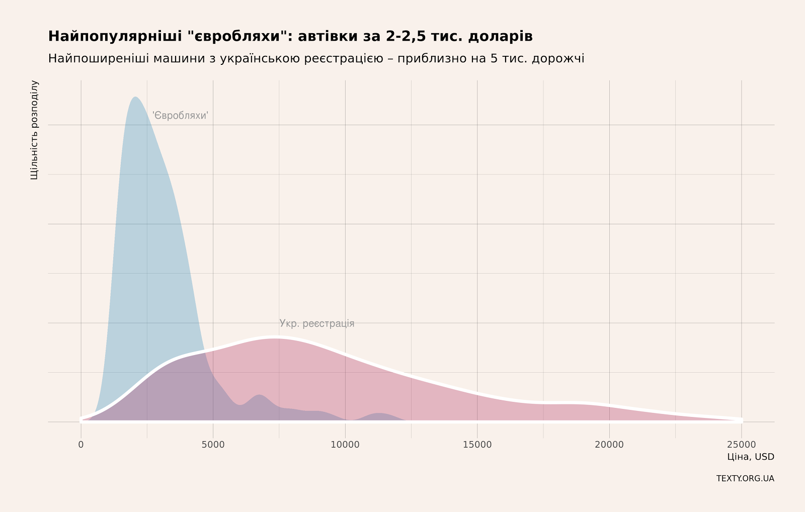 На рисунке ниже мы показали машины без украинской регистрации (изображены синим цветом), и зарегистрированные в Украине (красным). Видно, что возраст машин сильно отличается (данные на графике по состоянию на январь 2018 года). Что означает график распределения: чем выше график в точке для какого-то года, тем больше таких автомобилей на рынке.