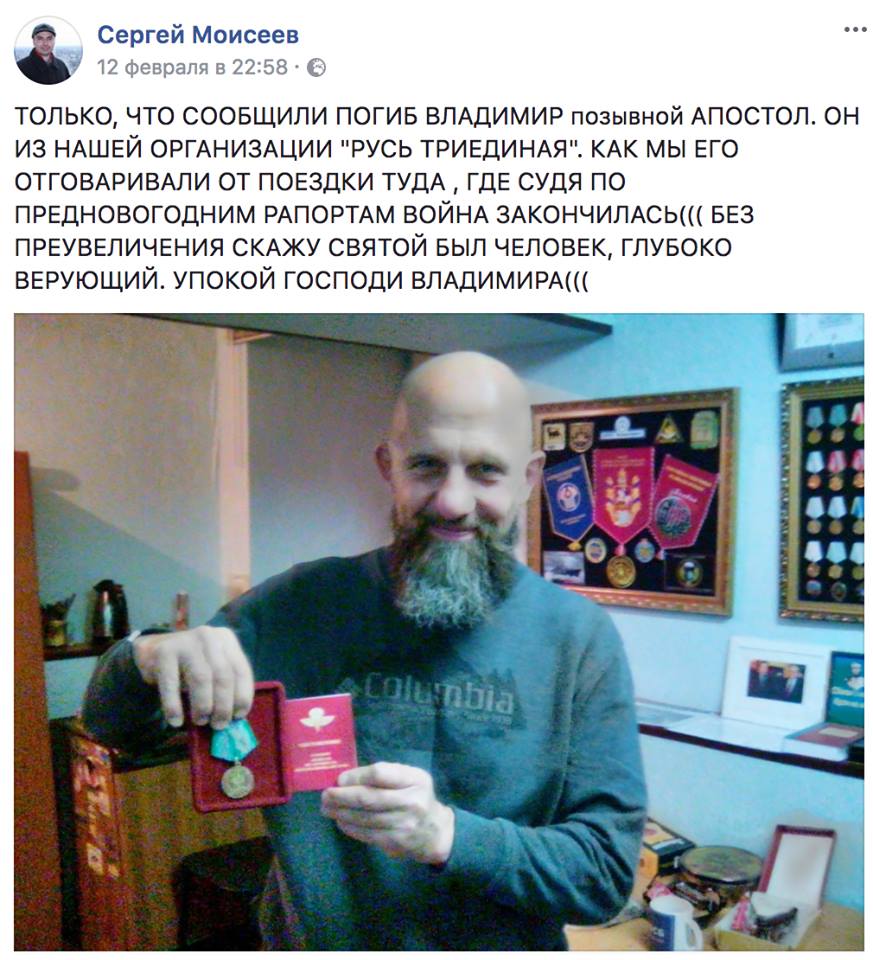 О гибели члена организации «Русь Триединая» сообщил в соцсети бывший председатель правления этой организации Сергей Моисеев. Погибший — Владимир с позывным «Апостол» (фамилия на данный момент неизвестна).