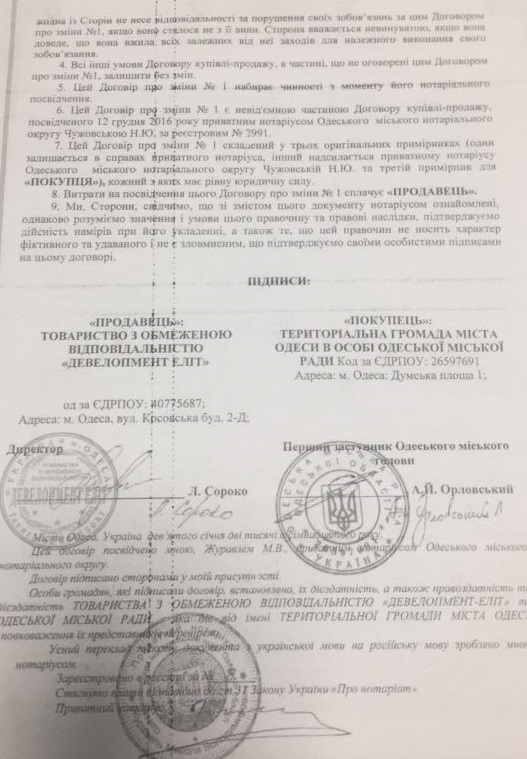 Зв нее даже ходатайствовал депутат облсовета Олег Бабенко, пытавшийся подкупить детективов за 500 тыс. долларов. В начале 2018 года участники аферы придумали новую схему. Фирма «Девелопмент элит» обратилась к горсовету с официальным письмом с просьбой изменить условия договора, снизив сумму сделки на 95 млн гривен! Руководство мэрии идет навстречу пожеланиям «бизнесменов». Уже 9 января и.о. мэра Анатолий Орловский и директор фирмы – гражданка Литвы Людмила Сороко подписывают т.н. «Договор об изменениях №1 к договору купли-продажи 12 декабря 2016 года» (речь идет о покупке админкорпуса завода «Краян» – Ред.).