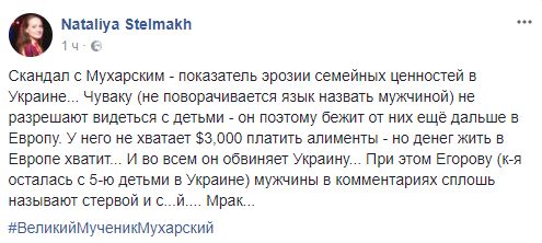 Наталья Стельмах пишет, что скандал с Мухарским - показатель эрозии семейных ценностей в Украине: "Чуваку (не поворачивается язык назвать мужчиной) не разрешают видеться с детьми - он поэтому бежит от них ещё дальше в Европу. У него не хватает $3,000 платить алименты - но денег жить в Европе хватит... И во всем он обвиняет Украину... При этом Егорову (к-я осталась с 5-ю детьми в Украине) мужчины в комментариях сплошь называют стервой и с...й.... Мрак..."