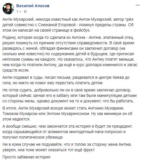 Блогер Елена Лешенко: "Пост Антіна Мухарського - батька пятьох дітей...это очень наглядная история о том, как "революция" догнала революционера) и смех, и грех".
