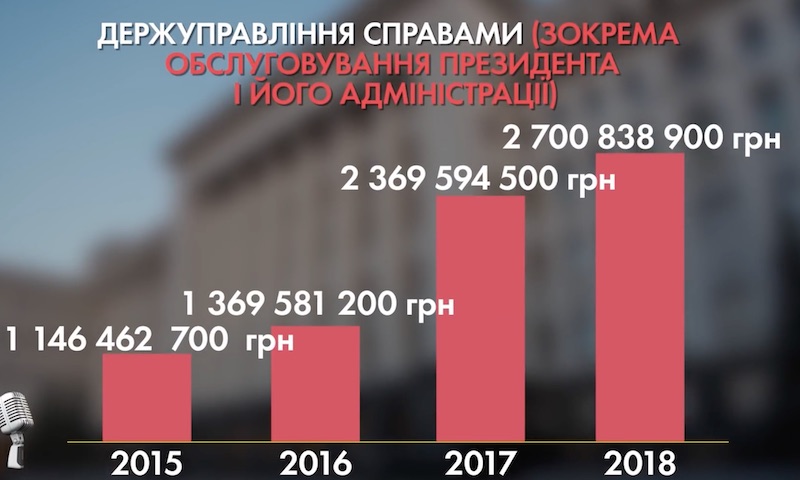 Например, Петр Порошенко обещал в 2015 году: «Мы будем сокращать Администрацию президента, а ГУД (Государственное управление делами) будет сокращать свои расходы». Но в каждом последующем постреволюционном году из бюджета на их содержание идёт всё больше и больше денег.