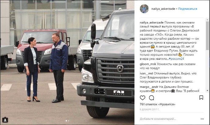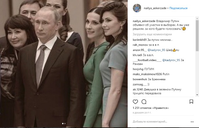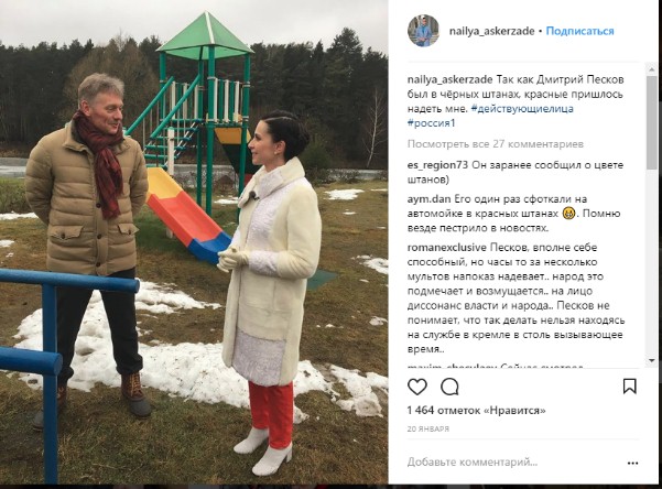 Инстаграм у Наили Аскер-заде нарядный: тут и президент Путин, и его пресс-секретарь Дмитрий Песков, и даже любитель норвежской рыбалки Олег Дерипаска.