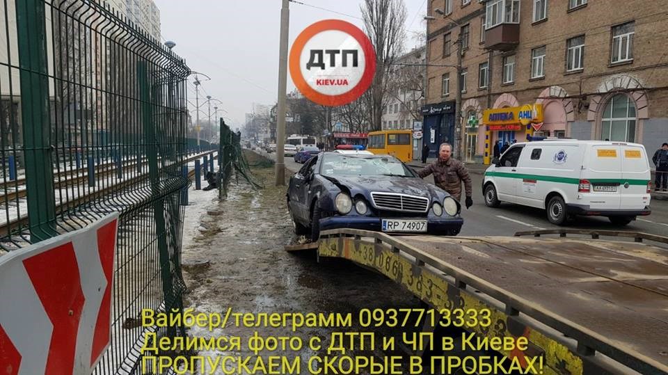 "Розыск пьяного виновника масштабного ДТП! Водитель синего Мерседес RP74907 скрылся на сером Мерседес DNM947! Последствия - уничтожены 2 авто, 20 метров ограждения, на 4 часа остановлено движение трамваев. Говорят, лицо арабской национальности, частый гость форсажа, житель общежитий НАУ", - сказано в сообщении.