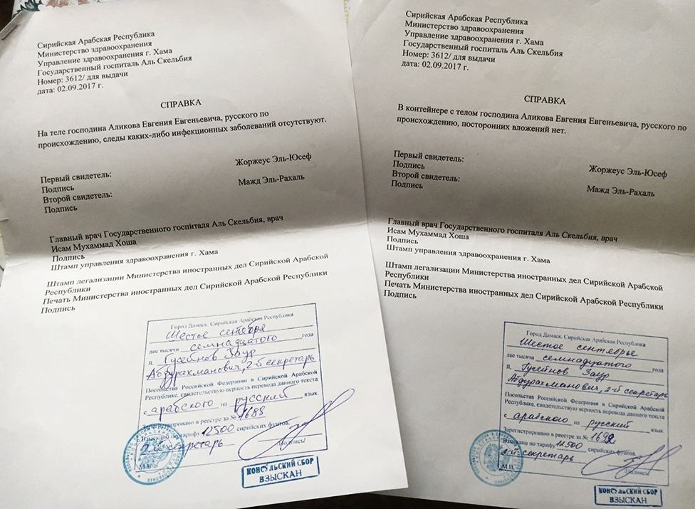 По информации ВВС, справки с арабского перевели на русский к 6 сентября, за что российское посольство заплатило 37 500 сирийских фунтов — около пяти тысяч рублей. Подпись за подлинность перевода поставил второй секретарь посольства России в Сирии Заур Гусейнов.