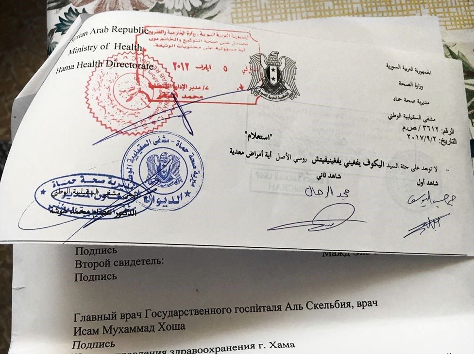 Согласно документам, которые Атюшева передала журналистам, тело ее сына 2 сентября привезли в государственный госпиталь Аль Скельбия, который находится в городе Хама (160 км от Тиаса, где он погиб). Тело осмотрели медики в присутствии двух свидетелей.