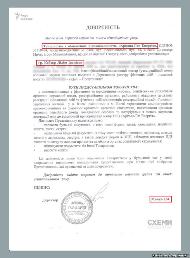 Про те, що фірмою «Аркона Газ-Енергія» керують зовсім інші люди, ніж зазначено у відкритому реєстрі, свідчить ще один факт. Редакція також дістала копію довіреності на представництво інтересів товариства, яку видав офіційний директор «Аркона Газ-Енергія» на ім’я Лілії Кобзар.