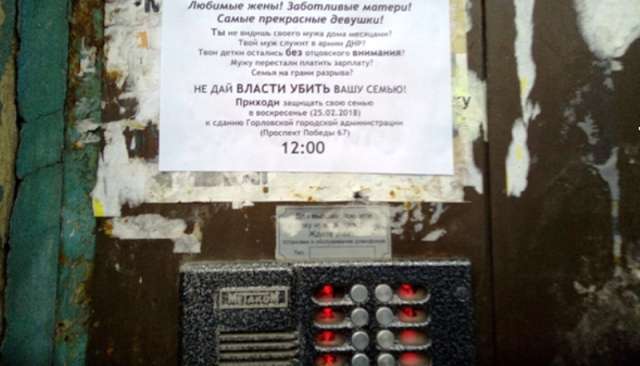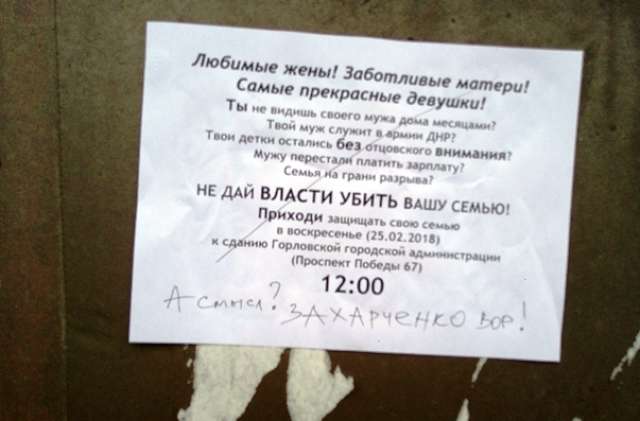 Так, в городе появились листовки с призывом к местным жителям собраться у здания Горловской горадминистрацими сегодня в 12:00 и выдвинуть требования к властям «ДНР».