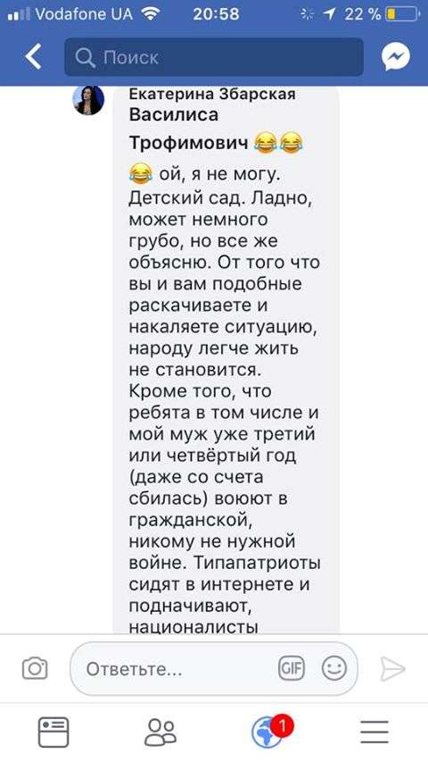 "Мы воюем с Рашкой, наши друзья воюют с Рашкой. А у депутата Днепровского горсовета, оказывается, муж воюет "в гражданской, никому не нужной войне". Хочется передать бодрый привет этому "фронтовику". Депутат Катерина также советует мне одеть берцы и форму. Так если что, я их оттаскала два года, благодаря таким "сознательным гражданам", у которых "дедывоевали". Тот случай, когда даже если ты депутат и неплохой, а г**но при этом никуда не деть. Оно вот-вот да и проявится", - написала Трофимович.