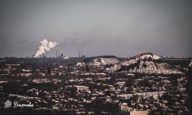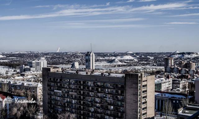 Так, на снимках видны припорошенные снегом терриконы, скованные льдом водоемы, пустынные улицы и залитая солнцем центральная площадь Ленина.