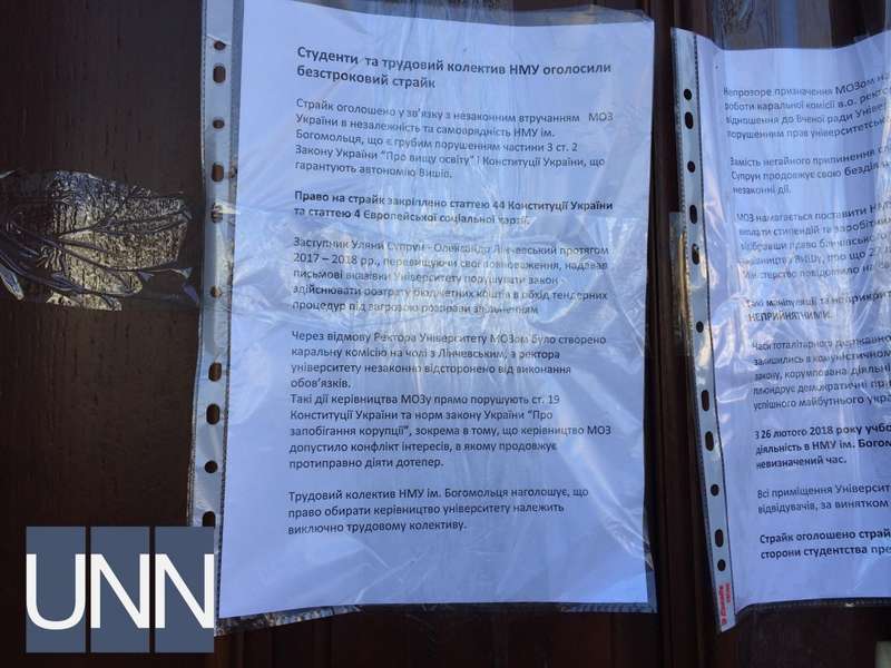 "Забастовка объявлена в связи с беспрецедентным грубым и незаконным вмешательством руководства Министерства здравоохранения Украины в независимость и самоуправление НМУ имени Богомольца, что является грубым нарушением части 3 ст.2 Закона Украины "О высшем образовании", Конституции Украины и других актов законодательства, гарантирующих автономию высших учебных заведений в Украине", - сказано в сообщении.