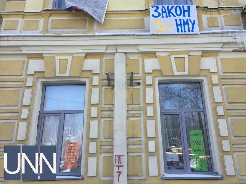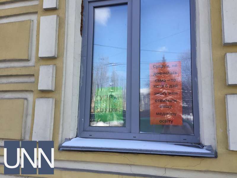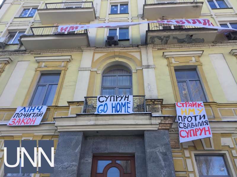 Само здание обвесили плакатами с надписями наподобие "НМУ против произвола", "Забастовка НМУ против произвола Супрун", "Кабмин, уволь Супрун" и тп.