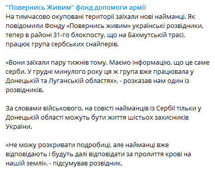 "На передовую заехали новые наемники оккупантов. По данным украинских разведчиков, в районе Бахмутской трассы работают снайперы из Сербии. Есть также информация, что на их руках уже есть кровь наших военных", - говорится в сообщении.
