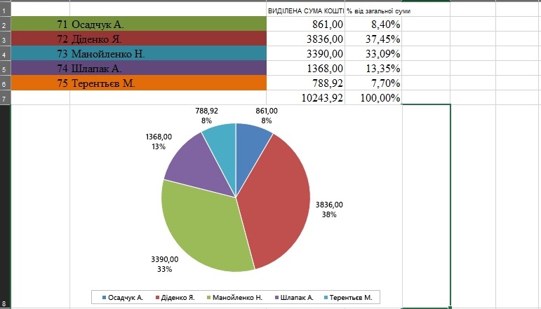 Округ Натальи Манойленко получил 33,09% средств - 3 млн 390 тыс. гривен. На округ Аллы Шлапак выделено 1 млн 368 тыс. гривен - 13,35%, на округ Андрея Осадчука и Михаила Терентьева по 861 и 748 тыс. гривен соответственно, что составляет 8,40% и 7,70%.