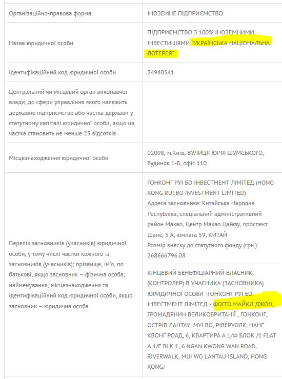 У свою чергу, за даними «Youcontrol», Майкл Джон Фогго відомий в Україні як бенефіціар ще трьох компаній: ТОВ «Сага Комюнікейшнз Юкрейн», ТОВ «УНЛ пей» і підприємства з 100% іноземними інвестиціями «Українська національна лотерея». Ці три фірми пов’язані з діяльністю найбільшої української мережі гральних закладів УНЛ. Власником опціону на викуп цієї фірми свого часу називав себе народний депутат від БПП Олександр Третьяков. У лютому в уряді зробили спробу прийняти ліцензійні умови, які б залишили на ринку лише одного оператора лотерей “УНЛ”. Однак АМКУ не погоджується з монополізацією ринку.