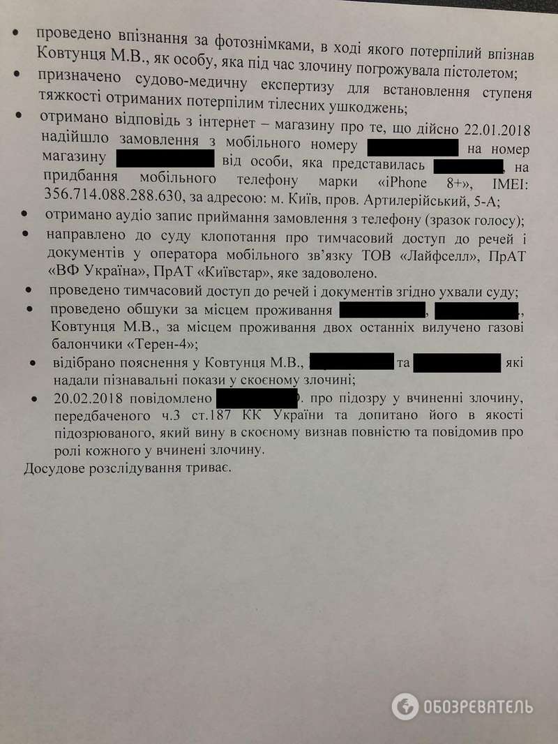 В ходе опознания курьер узнал в Ковтунце того, кто угрожал ему пистолетом. Участникам нападения вручили подозрения о совершении преступления.