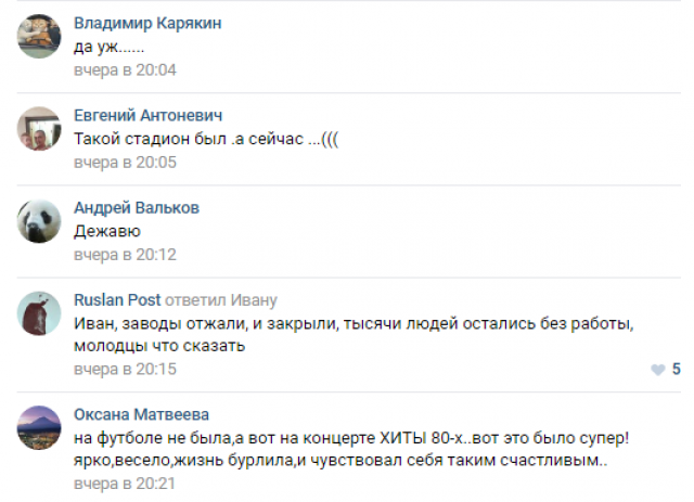 Так, в одном из сообществ в соцсети люди пишут: «Наша красавица „Донбасс Арена“ в Донецке. Стоит одинокая, никого там нет, даже утки улетели с пруда. Жалко, правда? Помните, там был и футбол, и концерты, потом наши бабушки-дедушки оттуда приносили продукты, которые Ахметов раздавал? Ни футбола, ни концертов, ни продуктов… Кому оно мешало — ну и раздавали бы дальше — или что, у нас уже нет тех, кто нуждается, уже все процветают? Блин, как жалко все-таки стадиончик! Сейчас прям мрак какой-то, аж до слез».