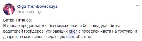 Однако рядовые киевляне несколько иного мнения, мягко говоря. Они жалуются на то, что все завалено снегом и очень трудно как пройти, так и проехать на машине.